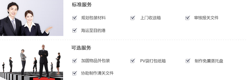 將所有物品進行包裝或上門取件至我司倉庫,PV帶打包紙箱并制作免熏蒸托盤,報關(guān)后海運至您指定的目的港,您需自行安排清關(guān)并繳納目的港港口費用后提貨。